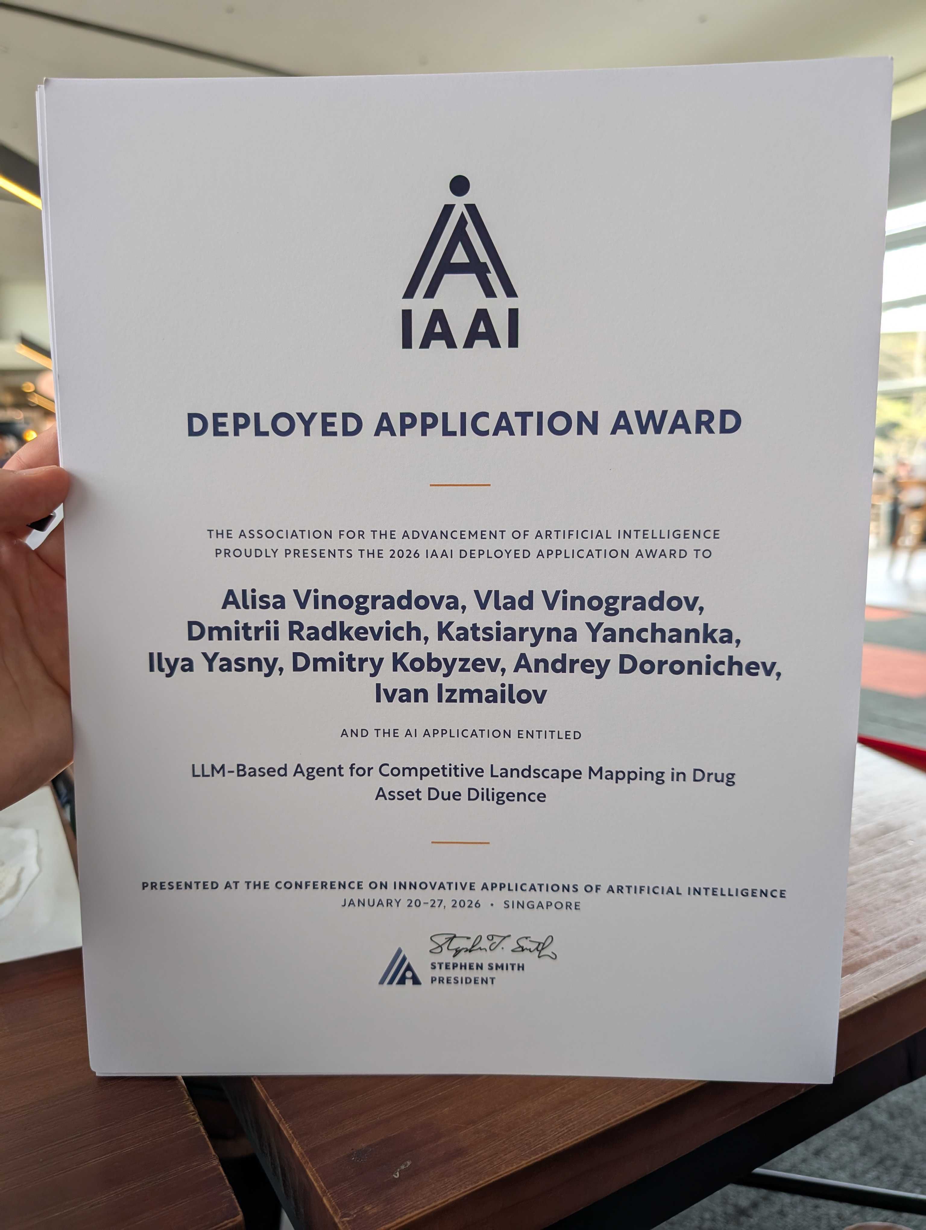 The paper — LLM-Based Agents for Competitive Landscape Mapping in Drug Asset Due Diligence — is now peer-reviewed and received the AAAI Deployed Application Award. That matters to us. This isn’t a toy benchmark or a demo. It’s AI that’s live, used by real pharma and biotech teams, and measurably changes how diligence gets done.